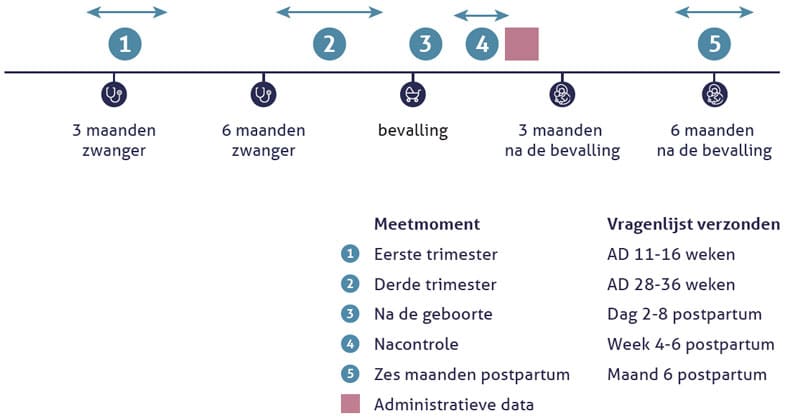 - Patiëntgerapporteerde uitkomsten (Patient-Reported Outcome Measures, ofwel PROMs) over gezondheid en welzijn; de cliënt/patiënt ontvangt op 5 momenten in haar zwangerschap en daarna vragenlijsten en geeft antwoord op gestelde vragen;
